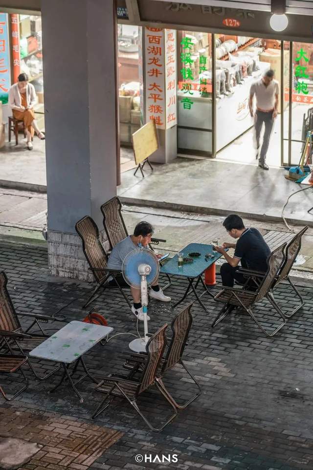 街头茶馆是浓浓的烟火气息,“吃饭喝茶一条龙”,2002年出生的小伙伴还记得小时候每次爸爸带他出去,和一群叔伯们吃完饭,下一场必是崇仁路茶摊。